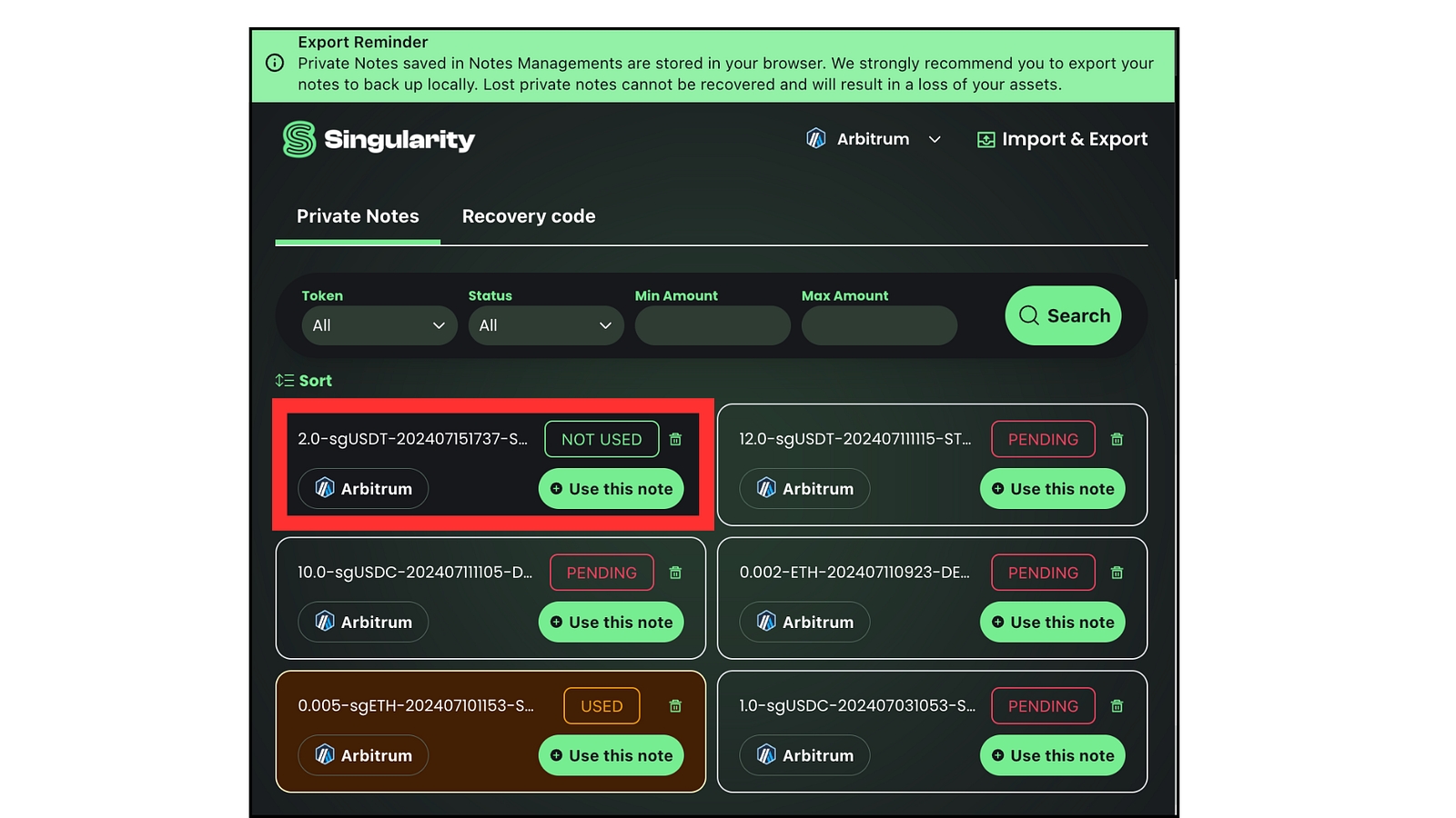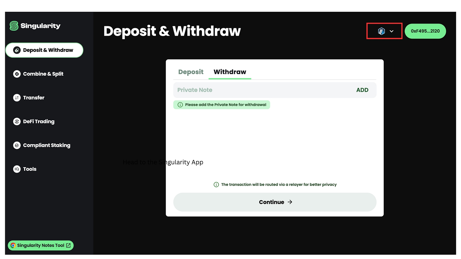 12. The following image will appear and this is where you can store your staked tokens within Singularity via Private Notes.
