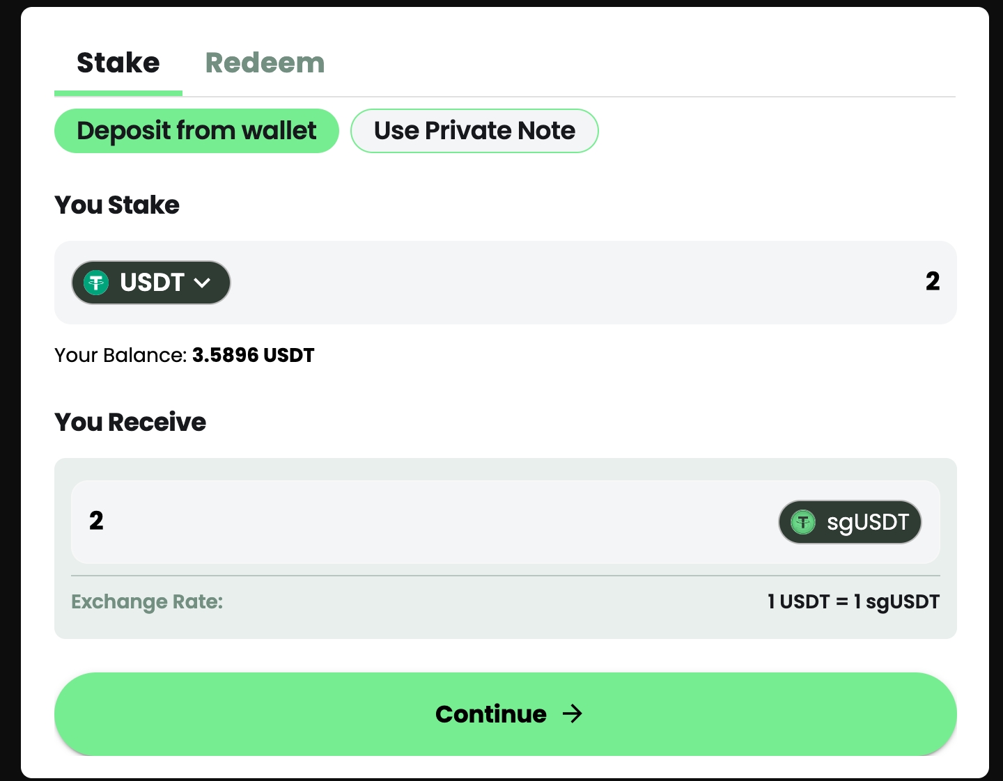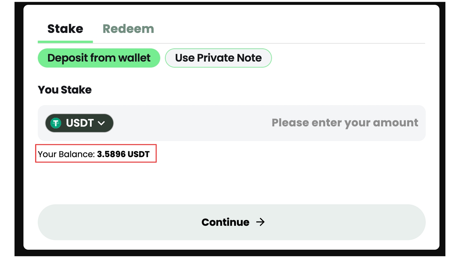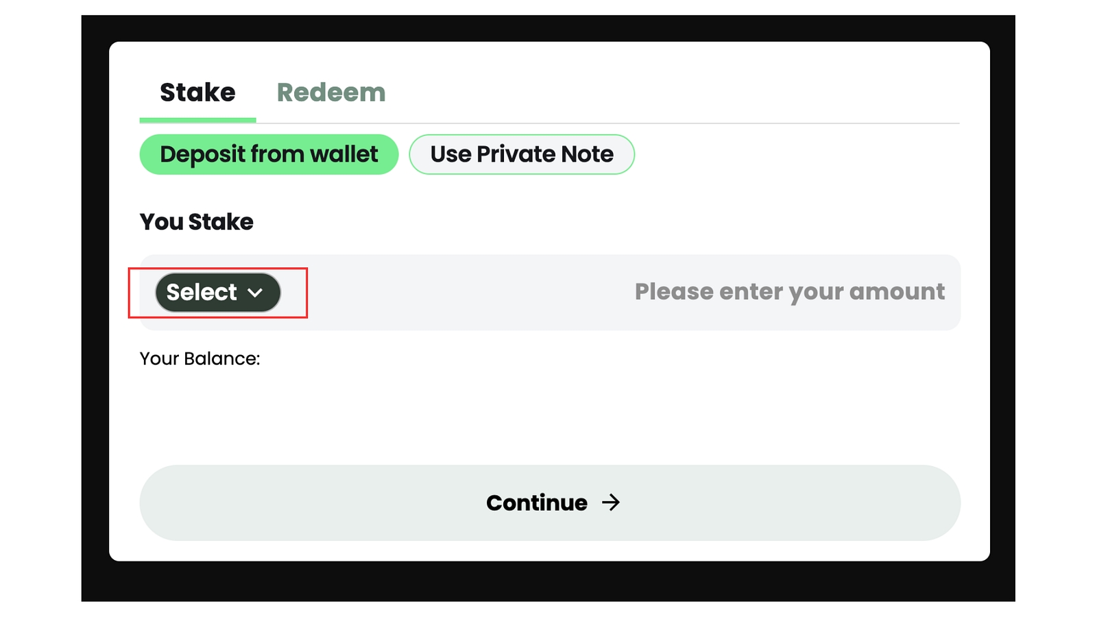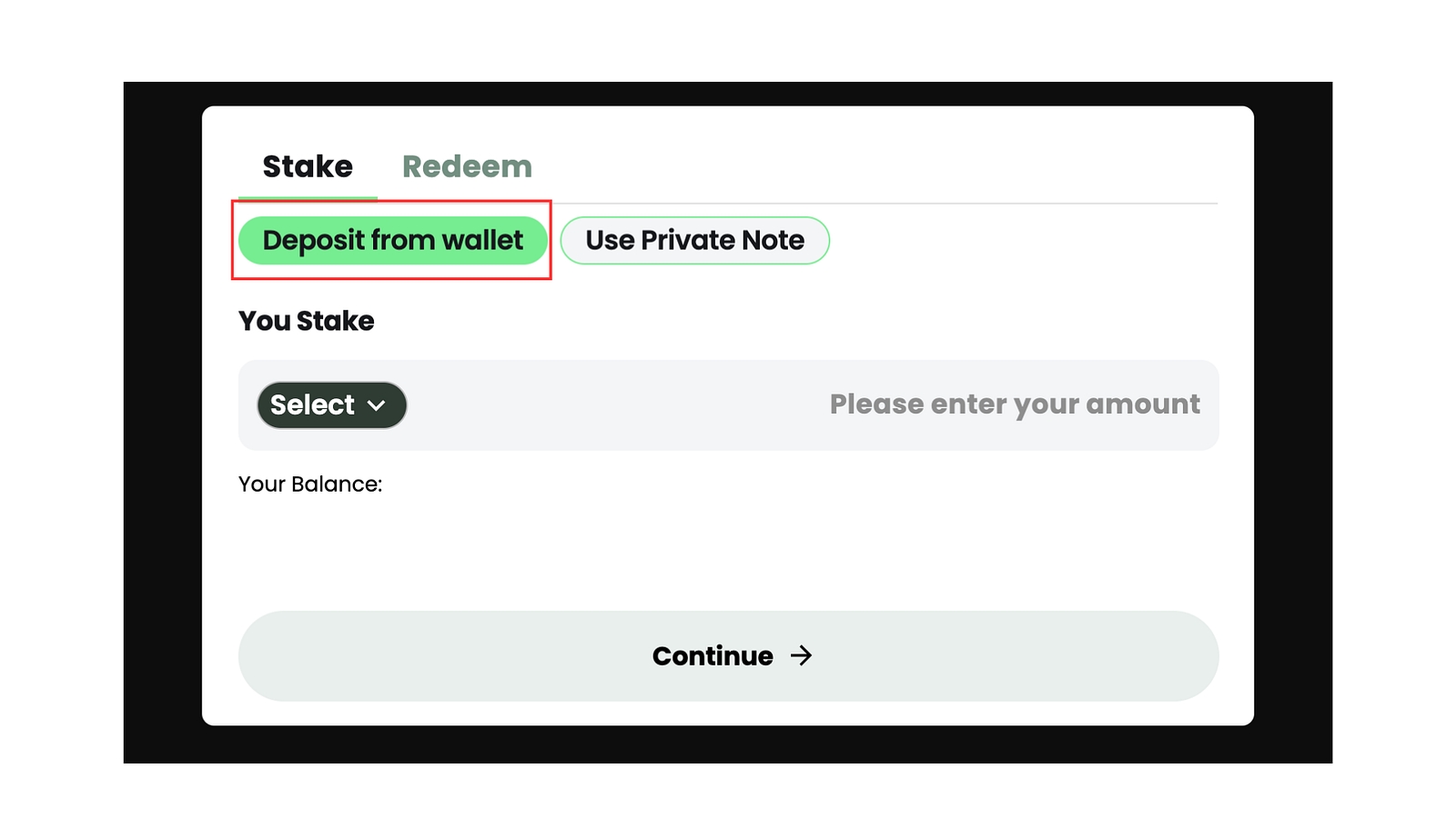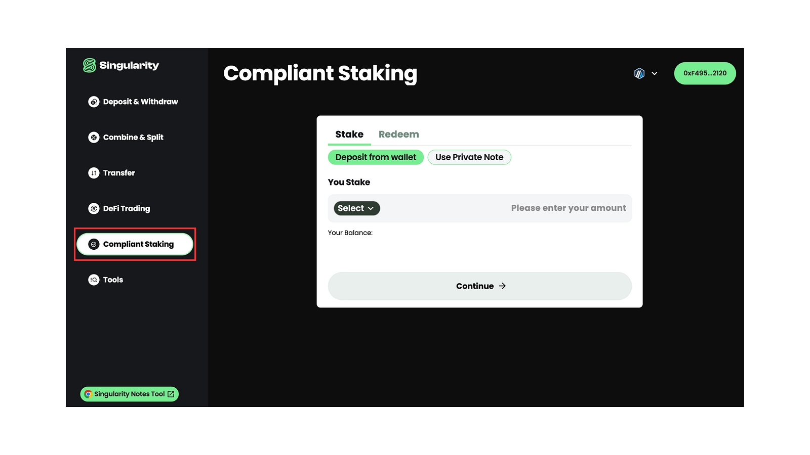 As you can see there are two ways to commence Compliant Staking: 1. “Deposit from Wallet” and 2. “Use Private Note”